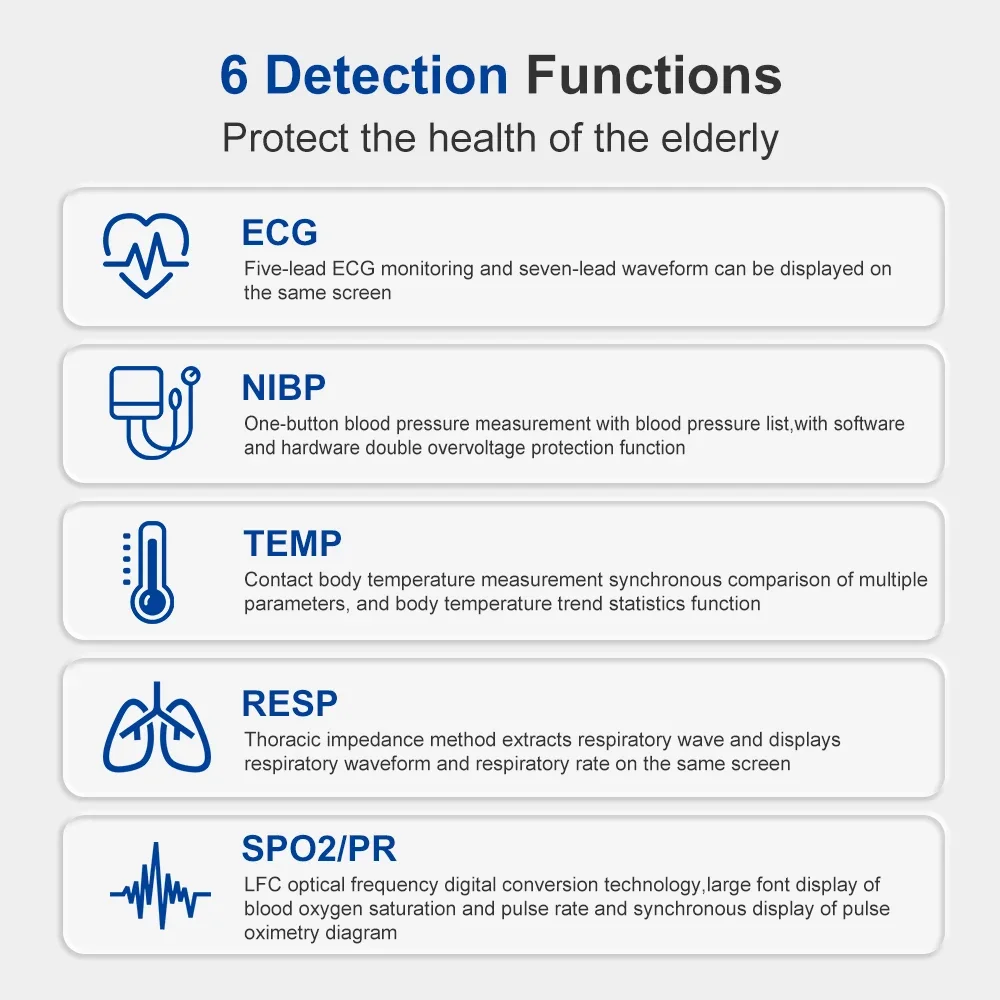 SpO2, PR/HR, NIBP, ECG, RESP, 2-TEMP