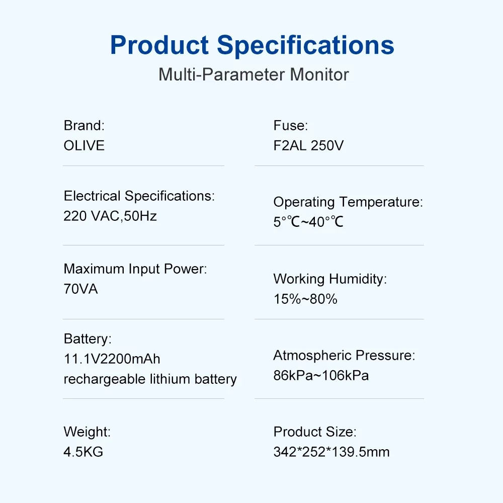 ✔ 400 groups of NIBP list, 6000 seconds ECG waveform recall, 60 alarm evens records recall, 7-day trend chart in storage