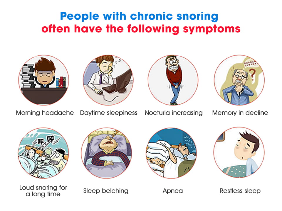 Mild snorers will suffer from hypoxemia, obesity, decreased memory, and dizziness due to decreased sleep quality. Symptoms such as low immunity: People with chronic snoring or severe snoring are often accompanied by sleep apnea syndrome. Repeated nocturnal hypoxia and hypercapnia caused by apnea can cause hypertension, coronary heart disease, and diabetes And cerebrovascular diseases, and even sudden death at night.